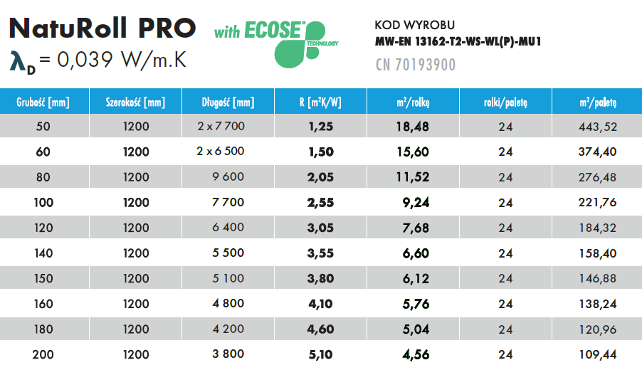 Wełna mineralna NATUROLL 039 PRO o współczynniku przewodzenia ciepła λD = 0,039 W/mK (immniejsza wartość tym lepsza izolacja). Produkt o wysokiej ognioodporności. Podwyższona sztywność produktu usprawnia tworzenie konstrukcji termoizolacyjnej. Wełna KNAUF jest odporna na odkształcenia.